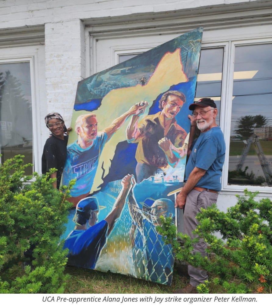 Artist Andrea Kantrowitz was so moved by the solidarity, unity, and shared sacrifice of the strikers that she painted the iconic Jay Strike Mural on the front of the union hall depicting key events of the strike. The mural features images of the strikers, some of whom were at the hall on July 1, holding raised hands in a show of solidarity and the mass meetings that filled the local high school gym to capacity every Wednesday for 16 months. It shows the workers singing songs like “Solidarity Forever” as the Local 14 band the Union Picketers played rousing labor songs at the mass meetings. The band even wrote some originals like “The Union Buster,” “BE&K’s (BEAKES)” and “Union Tiger.”