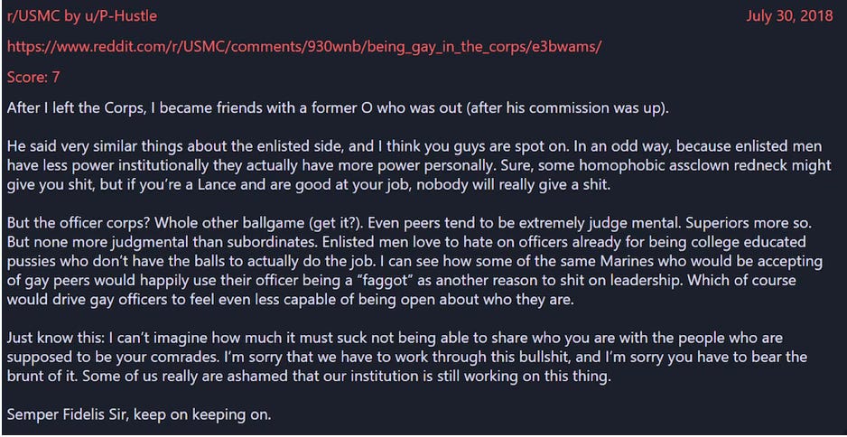 The total lack of context in the Advocate story leads me to wonder if the reporter either didn’t have access to the full archive of posts or if he just wasn’t interested in providing an accurate portrayal of Platner’s views on gay men. The article focused solely on the homophonic words Platner used, but not his actual views on gays in the military, which were very progressive. In 2012, he responded to an article about the military’s disgraceful treatment of same-sex spouses this way: