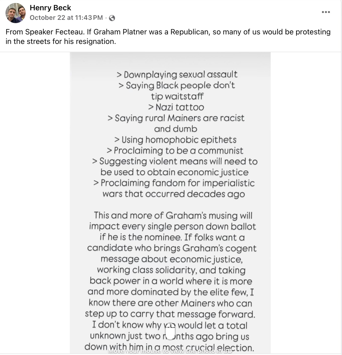 House Speaker Ryan Fecteau (D-Biddeford), who had planned to run against Platner if Mills didn’t jump into the race, claimed Graham had proclaimed “fandom for imperialistic wars that occurred decades ago.”