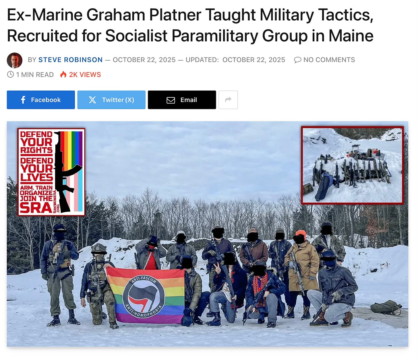 Without belaboring the point, as Platner’s Reddit archive clearly shows, he is, and always has been, a Dead Kennedys-loving, Nazi-hating antifascist and anyone who knows him knows this is a ridiculous smear. On the same day the tattoo story broke, the right-wing Maine Wire ran a story about Platner teaching a “defensive gun course” to radical lefties. The story featured a bunch of gun toting socialists holding a big pride banner with an Antifa symbol on it and the words “Anti-Fascism, Anti-Homophobia.”